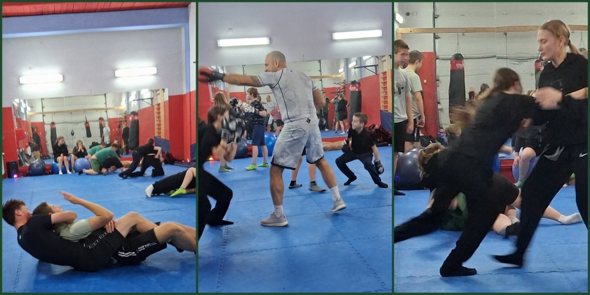 Migawki z treningu. Trener ćwiczy z kilkoma zawodnikami jednocześnie. Za nim nadzieja "Watahy", 10-letni Olek Dybiński z Olszewki